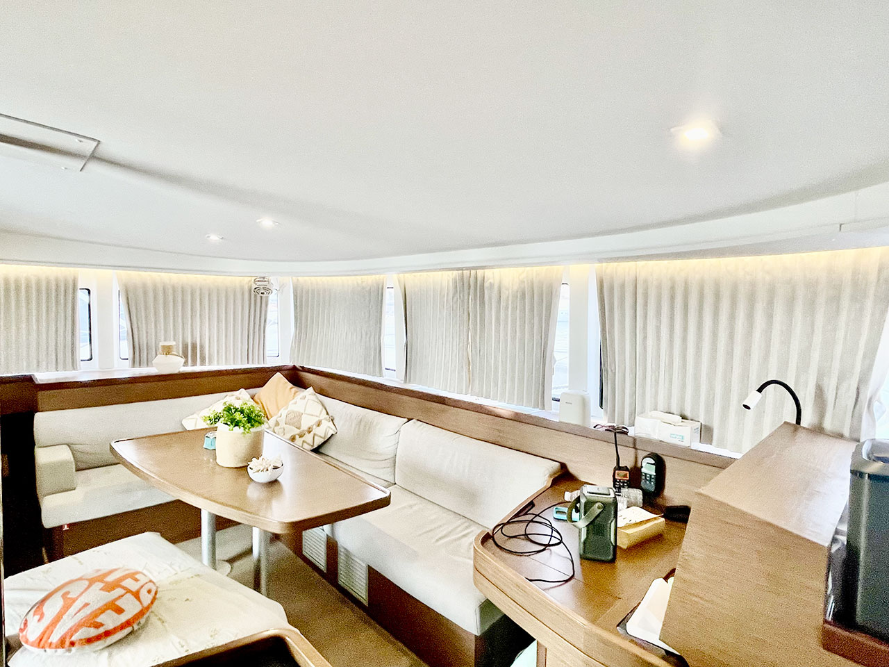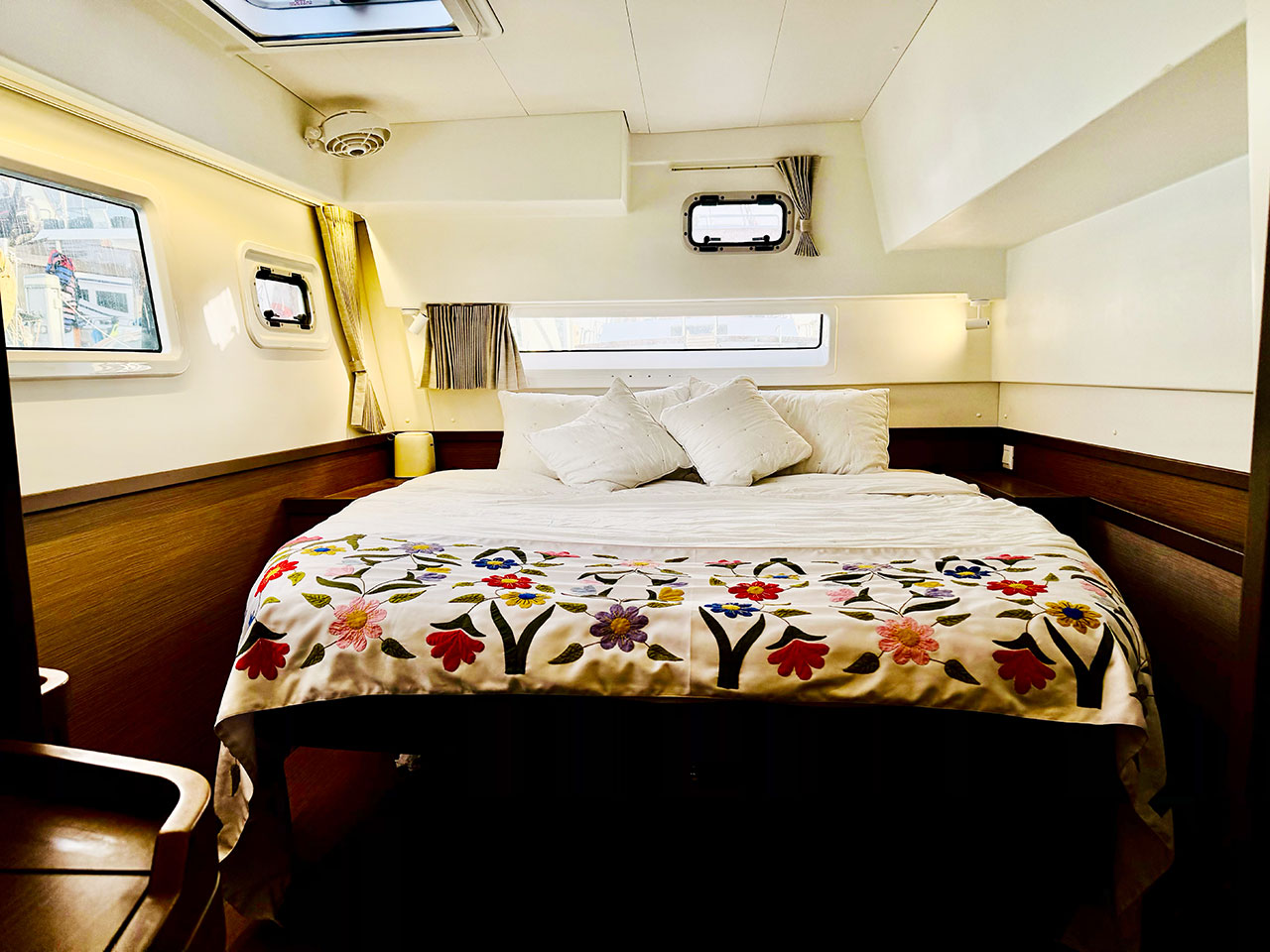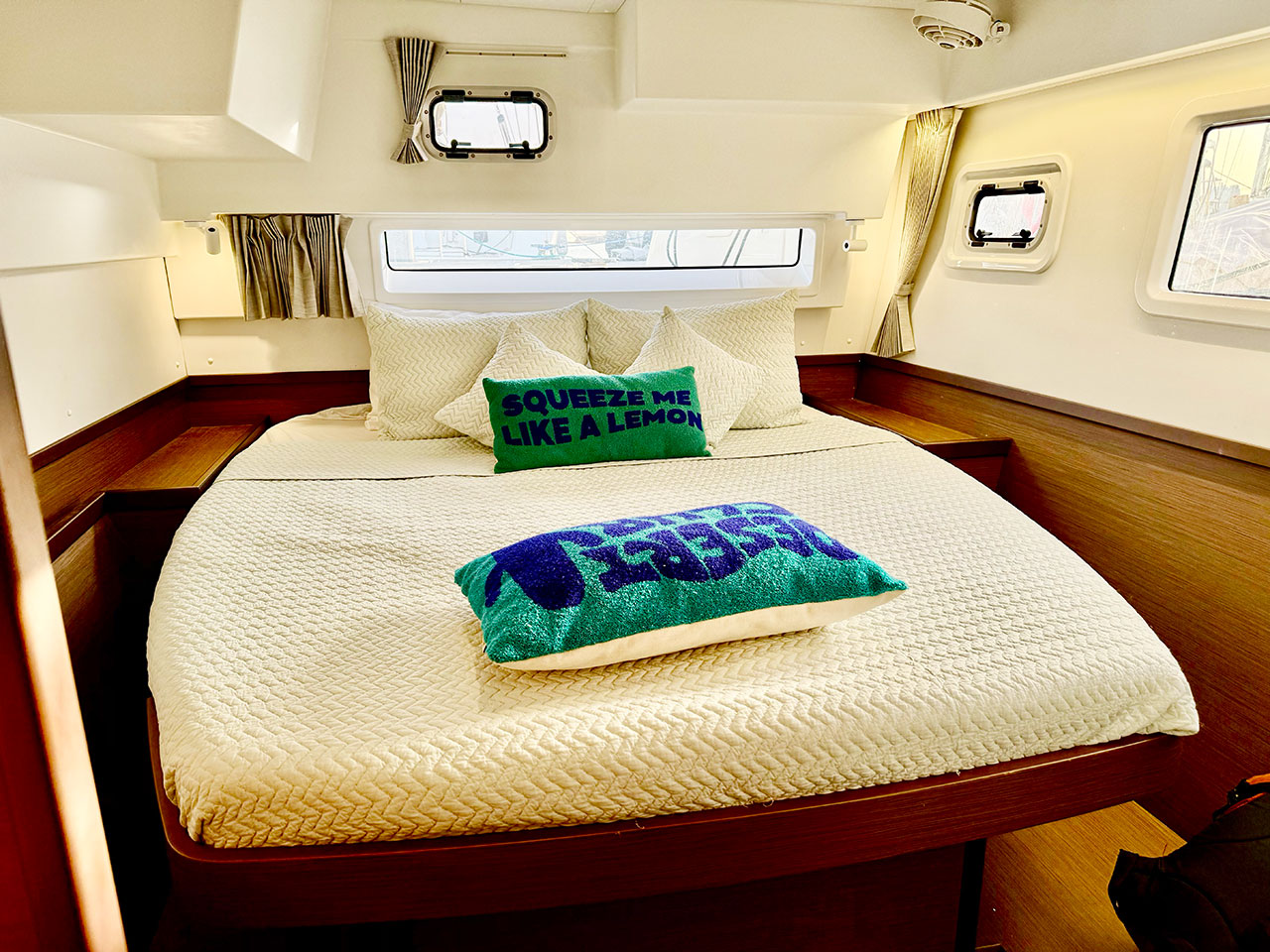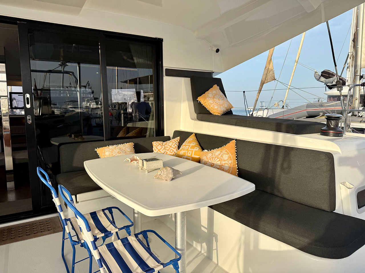 The bright panoramic salon opens straight into the cockpit, creating one big indoor-outdoor living area where everyone hangs out after a long day on the water. Plenty of deck space for rigging kites, chilling in the shade, or sunset beers at anchor.